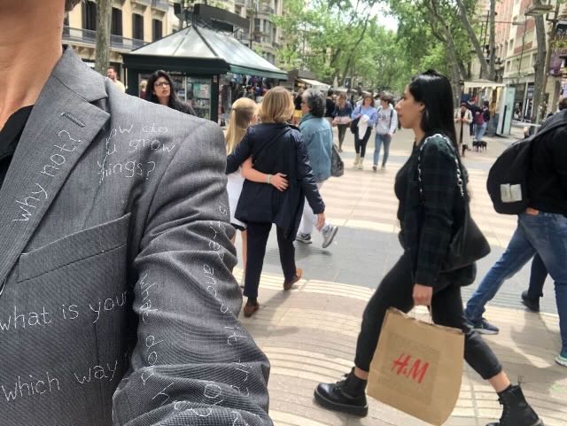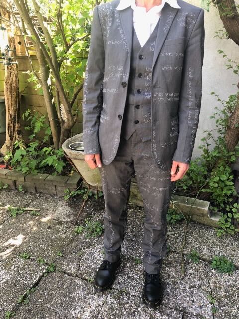 Most embroideries take at least an hour, the long questions might keep me occupied the whole morning. It is a slow process, I try to stay with the question while embroidering it, with the person who asked me the question. Some people send me questions through social media, others stop me when I am on my way somewhere or nowhere in particular to comment on the suit, and usually we get into a conversation that sometimes leads to a new question. ‘What does silence look like?’ a man walking his dog on the moor asked me after we discussed the absence of noise-free natural spaces in the Netherlands. I like that question, it is embroidered on the back of my trousers just under my belt. It is hidden most of the time, covered by the waistcoat and the jacket. ‘Where are the wild places?’ ‘They say we are running out of time, but if we change our approach to time, can we be in the world and everything in it in a different way?’