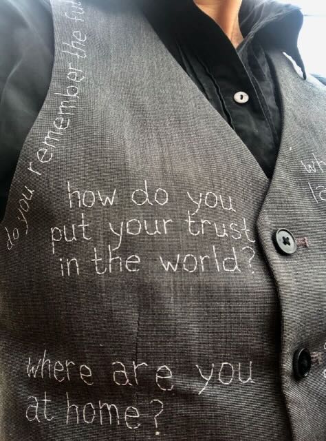 I embroidered a question on the trousers of my suit this morning: ‘What is progress?’ The progress of my suit is that it is slowly being covered in questions. ‘What if there is no tomorrow?’ ‘Do peppers grown in space taste better than peppers grown on earth?’ ‘Is standing still the best way forward?’